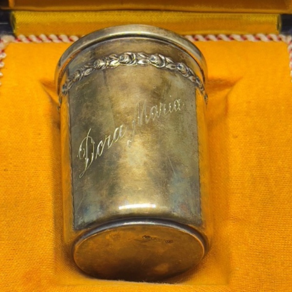 • METAL - Copo infantil em metal espessurado a prata,  interior em vermeil. No estojo.