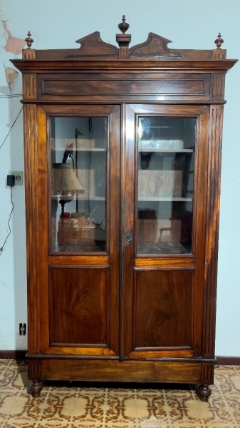 • MOBILIÁRIO - Antiga vitrine em madeira nobre, as colunas laterais caneladas e a cornija proeminente são elementos comuns em móveis do período Império no Brasil, porta envidraçadas, prateleiras internas. Móveis Usados - Lote de móvel antigo e usado, podendo apresentar marcas de uso e desgaste natural do tempo. Há possibilidade de danos ocultos e ou outras imperfeições.  Não há garantia ou possibilidade de devolução após a aquisição. Recomenda-se inspeção prévia.
