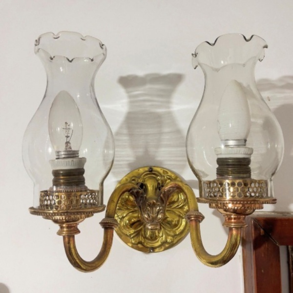 • LUMINÁRIA - Linda arandela dupla em metal dourado. Med. 13x28x26 cm. Marcas do tempo e de uso.