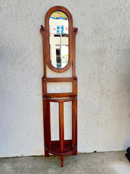 • MOBILIÀRIO - Chapeleiro e bengaleiro antigo em madeira nobre maciça, parte central marchetada,  com um espelho oval bisotado e ganchos laterais. Móveis Usados - Lote de móvel antigo e usado, podendo apresentar marcas de uso e desgaste natural do tempo. Há possibilidade de danos ocultos e ou outras imperfeições.  Não há garantia ou possibilidade de devolução após a aquisição. Recomenda-se inspeção prévia.