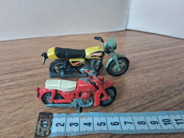 • Lote com 2 miniaturas de moto antigas fabricadas pela Matchbox Lesney na década de 70, uma Sunbeam 1914 e um Triumph T110 em escala reduzida.Se necessário solicitar mais fotos, vídeos ou perguntas para análise . Lembre-se de questionar sobre todas as dúvidas até o dia anterior ao dia do pregão ao vivo!Dúvidas devem ser enviadas via WhatsApp (24) 992260836 Grato