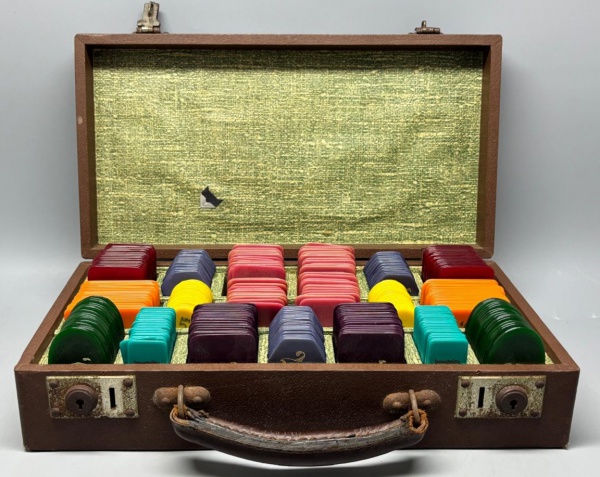 • Conjunto Clássico de Poker com Fichas Coloridas e MaletaRetrô e charmoso, este conjunto de poker inclui uma maleta vintage (8,5x35,5x19 cm) e 374 fichas coloridas, algumas com formatos diferenciados (ovais e hexagonais) e valores gravados. As fichas, de provável galalite, exibem uma paleta vibrante de amarelo, azul, cinza, verde, laranja, roxo, vermelho e rosa, prontas para as suas noites de jogo ou para enriquecer uma coleção de antiguidades. Apresenta marcas do tempo que adicionam caráter à peça.