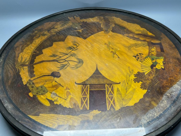 • COLECIONISMO - Antiga bandeja giratória, oriental, decorada com marchetária com cena do cotidiano, protegida por placa de vidro. Circa de 1900. Aro em metal. Med. 6x55,5 cm. Marcas do tempo e de uso. Necessita restauro.