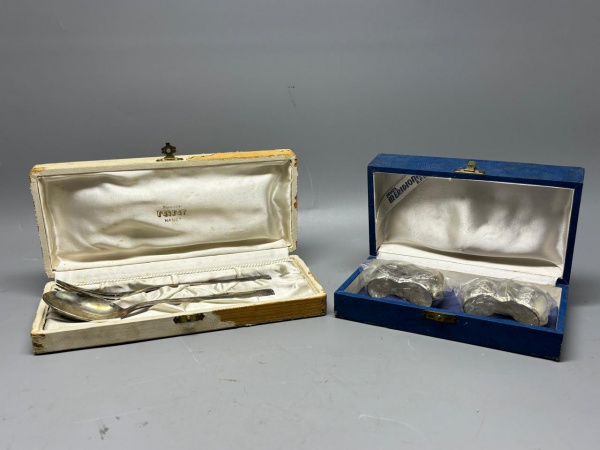 • METAL - FAQUEIRO - Conjunto de garfo e colher e par de porta guardanapos em metal espessurados a prata. Nos seus respectivos estojos. Med. 4x22,5x10 cm e 6x7x8,5 cm.