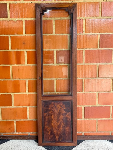 • MOBILIÁRIO - ELEMENTO ARQUITETÔNICO - FOLHA DE PORTA ANTIGA EM MADEIRA E VIDRO - Magnífica folha de porta antiga, confeccionada em madeira nobre escurecida, que exibe o requinte da marcenaria de outrora. A peça é dividida em dois painéis: o superior, envidraçado, proporciona leveza e entrada de luz; o inferior, apresenta um impressionante trabalho de marchetaria ou veios de madeira dispostos em padrão orgânico, formando um desenho em leque de grande impacto visual. Destaca-se ainda o elegante detalhe entalhado na parte superior da moldura. Ideal para projetos de restauração, para ser transformada em uma divisória de ambientes ou como um painel decorativo de parede, agregando história e sofisticação ao espaço. Peça de época, em ótimo estado de conservação, com pátina e sinais de uso compatíveis com sua idade. Med. 198x56 cm.