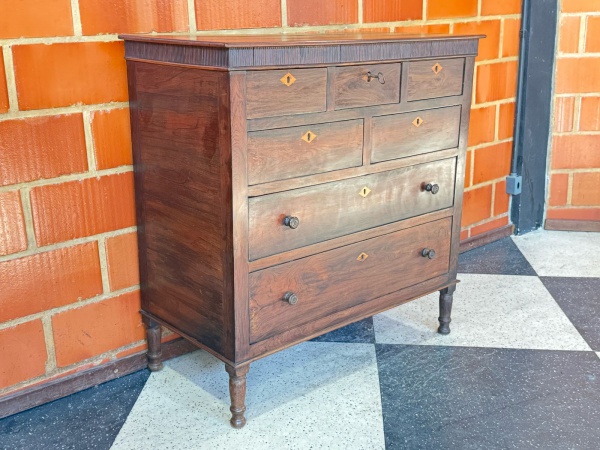 • MOBILIÁRIO - CÔMODA BRASILEIRA IMPÉRIO EM MADEIRA NOBRE  SÉC. XIXElegante cômoda antiga em madeira nobre (jacarandá), do período Império brasileiro, com linhas sóbrias e acabamento refinado. Possui um cofre embutido e sete gavetas de tamanhos variados com puxadores torneados em madeira e belos detalhes de embutidos geométricos nas entradas de chaves. Destaque para os pés torneados e a frisa superior entalhada em relevo. Peça rara, de grande valor decorativo e histórico, ideal para ambientes clássicos ou coleções de mobiliário antigo.Em bom estado estrutural, com chave original presente. Med. 114x112x67 cm.