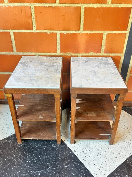 • MOBILIÁRIO - PAR DE MESINHAS ANTIGAS DE CABECEIRA / APOIO  COM TAMPO DE MÁRMOREConjunto de duas mesas antigas em madeira, com estrutura simples e funcional, compostas por duas prateleiras inferiores e tampo em mármore branco rajado, original da época. Peças versáteis, ideais para uso como criados-mudos, mesas laterais ou de apoio. Apresentam sinais de uso e desgaste nas prateleiras, compatíveis com a idade, necessitando leve restauro.Medidas aproximadas (cada): 61x55x40 cm.