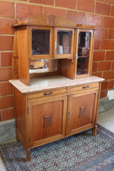 • MOBILIÁRIO - BELO ETAGER EM PERÓBA DO CAMPO COM MÁRMORE ROSA - Magnífico etager de época, confeccionado em nobre Peróba do Campo, que harmoniza a beleza da madeira com a elegância do mármore rosa. A peça apresenta um design clássico e funcional, ideal para valorizar qualquer ambiente. Com um distinto tampo em mármore rosa, o móvel é equipado com duas gavetas que oferecem praticidade de armazenamento. A parte superior é composta por um espelho bisotado central, ladeado por três portas envidraçadas, perfeitas para exibir louças finas, cristais ou coleções. Os detalhes em relevo nas portas e na moldura superior enriquecem ainda mais o conjunto. Este etager é uma peça de destaque para salas de jantar, salas de estar ou halls, combinando utilidade e um apelo estético refinado. Em bom estado de conservação, com a pátina que o tempo lhe conferiu.. Med. 185x127x53 cm.