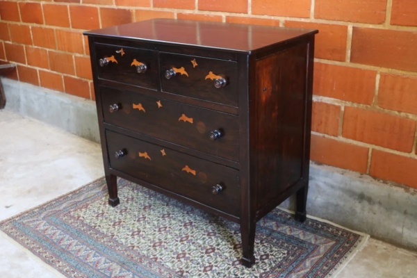 • MOBILIÁRIO - COMODA D. MARIA EM JACARANDÁ COM MAQUETTERIE - Raríssima cômoda de estilo Dona Maria, confeccionada em nobre jacarandá, uma madeira altamente valorizada pela sua beleza e durabilidade. A peça é composta por dois amplos gavetões e duas gavetas superiores menores, oferecendo excelente espaço de armazenamento. Seu diferencial reside no primoroso trabalho de maqueterrie que adorna a frente das gavetas, revelando padrões artísticos delicados. Os puxadores torneados complementam o design clássico da cômoda. A peça apresenta as naturais marcas do tempo, que atestam sua autenticidade e história, incluindo vestígios de uma antiga troca de lugar dos puxadores. Um item de colecionador, ideal para enriquecer ambientes com elegância e tradição. Em bom estado de conservação, considerando sua idade.. Med. 110 x 115 x 62 cm.