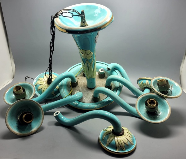 • LUSTRE - Lustre em porcelana, esmaltado em tom azul com flores policromadas com 6 braços. No estado. Necessita restauro.