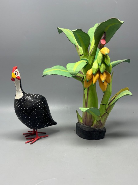• DIVERSOS - Lote de escultura de bananeira e galinha d' angola. Med. 27 cm e 18 cm.